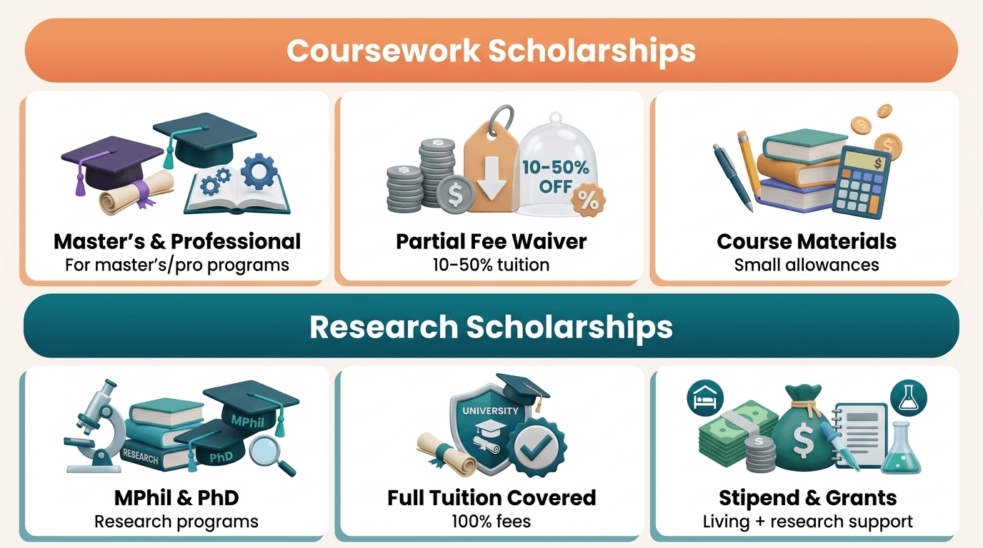 Most postgraduate scholarships in Malaysia usually fall into two clear categories: coursework scholarships (mostly partial tuition fee waivers) and research scholarships (which can be fully funded).